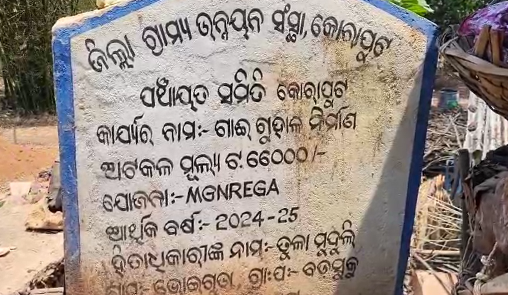 କୋରାପୁଟ ଜିଲ୍ଲା କୋରାପୁଟ ବ୍ଲକ ବଡ଼ ସୁକୁ ପଞ୍ଚାୟତ ଅନ୍ତର୍ଗତ ଭୋଇଗୁଡ଼ା ଗ୍ରାମରେ ଏହି ଘଟଣା ଦେଖିବାକୁ ମିଳିଛି । ମନରେଗା ଯୋଜନାରେ ଗାଈ ଗୁହାଳ ନିର୍ମାଣ ପାଇଁ ୬ ଜଣ ହିତାଧିକାରୀଙ୍କୁ ଚୟନ କରାଯାଇଥିଲା । ସରକାରୀ ନିର୍ଦ୍ଦେଶ ପାଇ ସେମାନେ ନିଜର ପୁରୁଣା ଗୁହାଳକୁ ଭାଙ୍ଗି ନୂଆ ଗୁହାଳ ତିଆରି କରିଥିଲେ । ଗ୍ରାମବାସୀମାନେ କହୁଛନ୍ତି ସରକାରୀ ବାବୁମାନେ ବାରମ୍ବାର ଘରକୁ ଆସି ଶୀଘ୍ର କାମ ସମାପ୍ତ କରିବାକୁ କହୁଥିଲେ । ଫଳରେ ସେମାନେ ଧାର କରିବା ସହିତ ନିଜ ସଞ୍ଚିତ ଧନ ବ୍ୟୟ କରି ଗୁହାଳ ନିର୍ମାଣ କରିଥିଲେ । ଗୁହାଳ ସମ୍ମୁଖରେ ସରକାରୀ ଫଳକ ମଧ୍ୟ ଲଗାଯାଇଛି, ଯେଉଁଠାରେ ୨୦୨୪-୨୫ ଆର୍ଥିକ ବର୍ଷରେ ୬୬ ହଜାର ଟଙ୍କା ବ୍ୟୟ ହୋଇଥିବା ଉଲ୍ଲେଖ ରହିଛି।