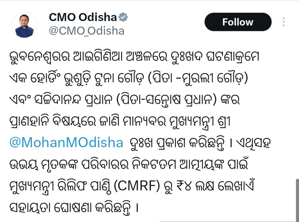 Uncategorized ହୋର୍ଡିଂ ପଡ଼ି ଦୁଇ ମୃତ ଘଟଣା, ମୁଖ୍ୟମନ୍ତ୍ରୀ ଙ୍କ ଘୋଷଣା ମୃତକଙ୍କ ପରିବାରକୁ ୪ ଲକ୍ଷ। Anil DhalFebruary 25, 2026February 25, 2026 ହୋର୍ଡିଂ ପଡ଼ି ଦୁଇ ମୃତମୁଖ୍ୟମନ୍ତ୍ରୀ ରିଲିଫ ପାଣ୍ଠିରୁ ସହାୟତା ଘୋଷଣା କଲେ ମୁଖ୍ୟମନ୍ତ୍ରୀମୃତକଙ୍କ ପରିବାରକୁ ୪ ଲକ୍ଷ ଲେଖାଏଁ ମିଳିବ