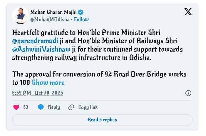 ଡ଼ିଶାର ଭିତ୍ତିଭୂମି ବିକାଶ ପ୍ରତି କେନ୍ଦ୍ର ସରକାରଙ୍କ ଏହି ସହୃଦୟତାପୂର୍ଣ୍ଣ ପଦକ୍ଷେପ ପାଇଁ ମୁଖ୍ୟମନ୍ତ୍ରୀ ମୋହନ ଚରଣ ମାଝୀ ପ୍ରଧାନମନ୍ତ୍ରୀ ନରେନ୍ଦ୍ର ମୋଦୀ ଏବଂ କେନ୍ଦ୍ର ରେଳମନ୍ତ୍ରୀ ଅଶ୍ୱିନୀ ବୈଷ୍ଣବଙ୍କୁ ଓଡ଼ିଶାବାସୀଙ୍କ ପକ୍ଷରୁ ଧନ୍ୟବାଦ ଓ କୃତଜ୍ଞତା ଜଣାଇଛନ୍ତି।